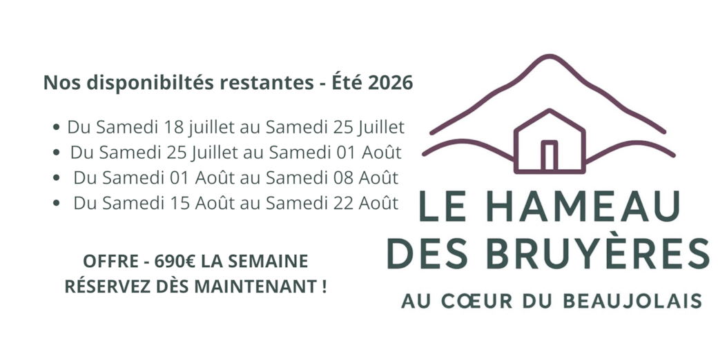 Profitez d’un cadre authentique, de balades dans les coteaux, de visites de domaines viticoles et d’activités de détente et œnotourisme à proximité directe. Que vous recherchiez un week-end romantique, un séjour en famille ou une escapade entre amis, Le Hameau des Bruyères est l’endroit parfait pour découvrir le Beaujolais.